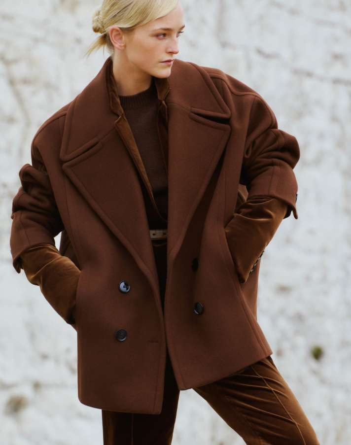 Основные черты — четкая линия плеча, два ряда пуговиц, возможны погоны, аккуратный воротник, часто длина по икру. Образ получается собранным и выразительным. Пусть пальто играет первую скрипку, а остальное будет проще: джинсы прямого кроя, грубые ботинки, свитер рисовой вязки. На выход можно заменить ботинки на сапоги на устойчивом каблуке и добавить шелковый платок под ворот. Двубортная модель любит контраст, например, светлый низ с темным верхом или наоборот. Пуговицы и фурнитура задают тон, поэтому украшений должно быть минимум — кольцо-печатка или лаконичные клипсы.