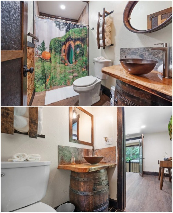 На нижнем уровне предусмотрена еще и благоустроенная ванная комната со всеми современными бытовыми удобствами и занавеской в стиле «Властелина колец», отделяющей душевую часть от остального пространства. Особенное внимание хотелось бы обратить на туалетный столик у зеркала. Его функцию выполняет большая дубовая бочка, в которой сделали дверку и установили парочку полок для хранения косметических и моющих средств.