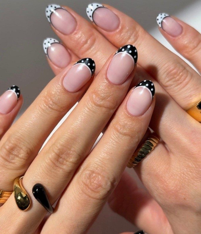 Интересная идея – отзеркалить цвета на разных руках. На одной сделать черные кончики в белый горошек, на другой – белые в черный.