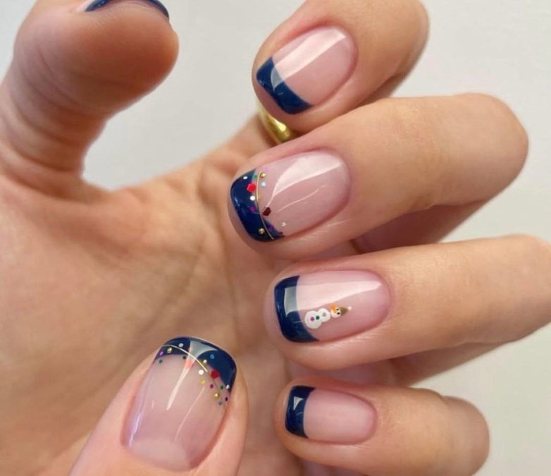Один из самых популярных оттенков цветного френча в декабре 2025, цвет новогодней ночи – глубокий синий. Он не выглядит «грязно», красиво сочетается с блестящими лаками и рождественскими украшениями.