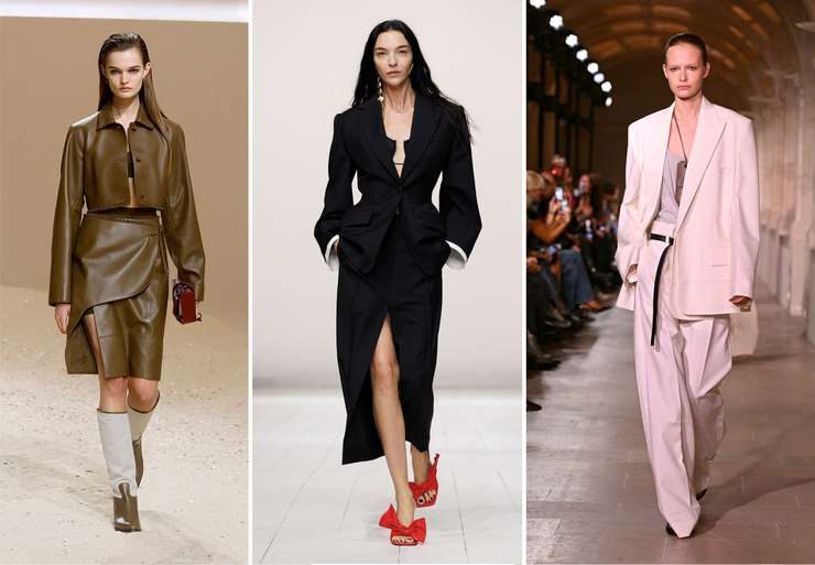 — Пропорции с характером. Укороченный жакет с длинными, «колонными» брюками; мягкий блейзер на полразмера больше с миди-юбкой прямого кроя: по бедру сидит аккуратно, ниже колена дает свободу за счет разреза.