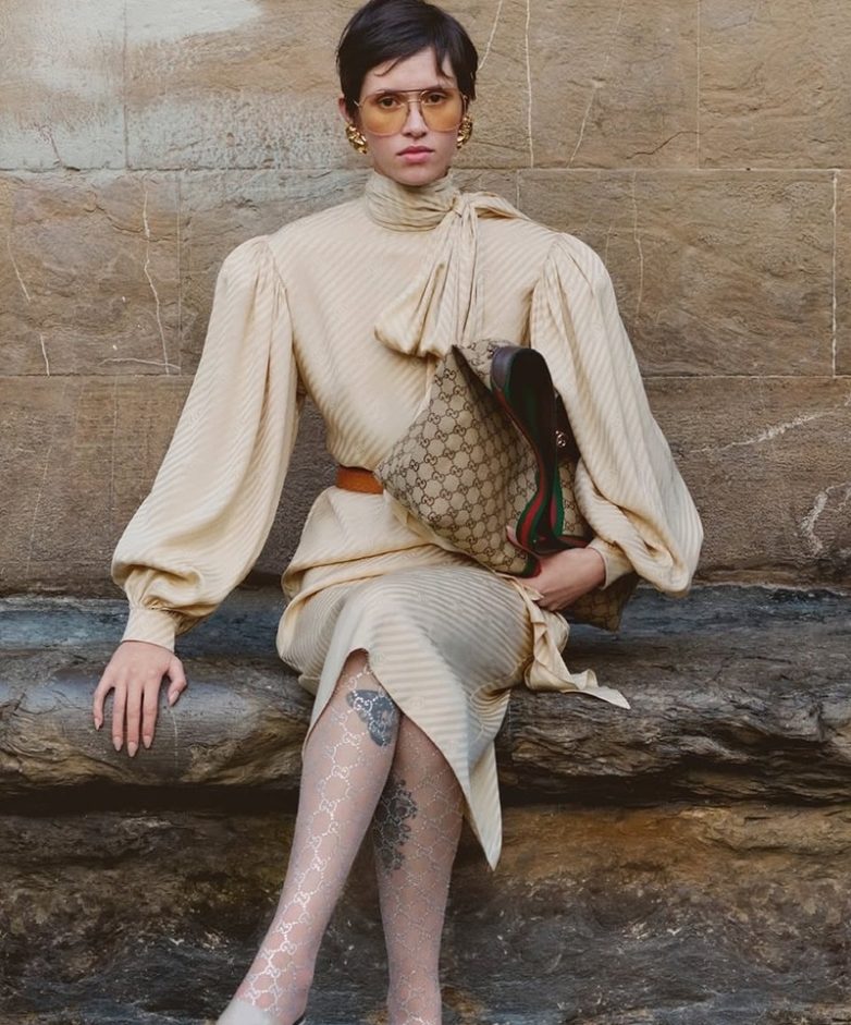 В 2015 все было тон-в-тон, но теперь в тренде смелые сочетания. Например, прозрачные колготки под тяжелое платье с мехом или блестящие под матовое. Добавь аксессуары: сумку в форме голубя (как у LOEWE) или шарф в клетку. Для дневного лука: белые колготки под темное платье с яркими серьгами. Вечером: зеленые с золотистым платьем и металлическими браслетами. Контрасты делают образ динамичным и оригинальным, помогая выделиться.