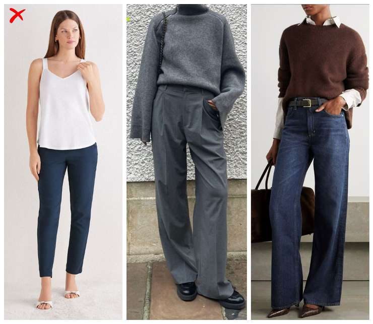 Основная задача перенести акцент в верхнюю часть с помощью принта, V-образного выреза и украшений. Брюки и джинсы выбираем свободные и прямые. В приоритете темные оттенки синего, серого и черного цвета. Посадка на талии средняя или завышенная, чтобы сделать акцент на талии.