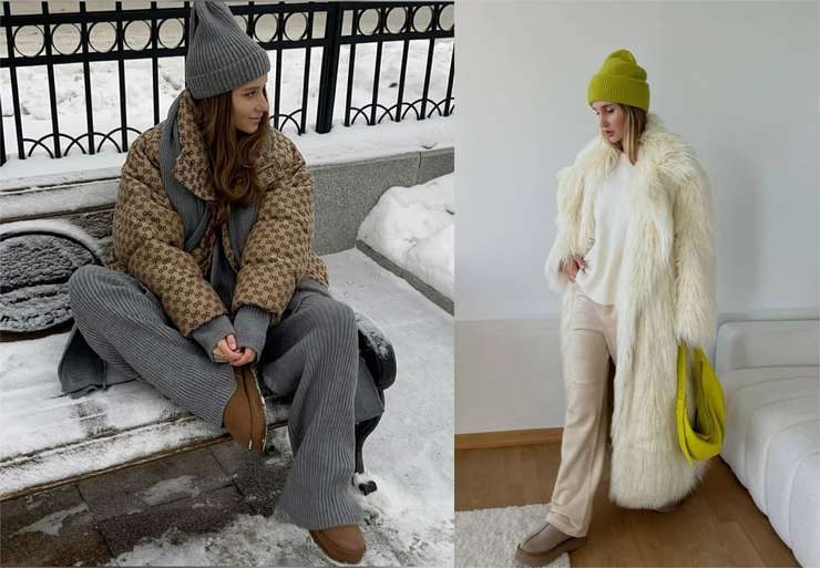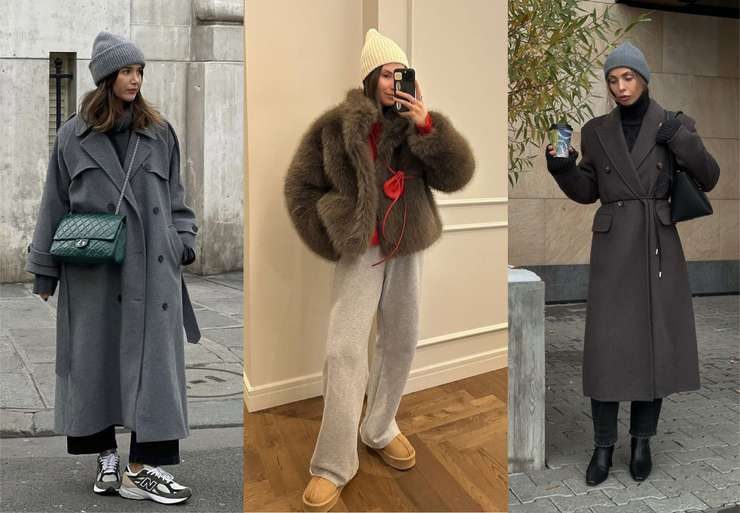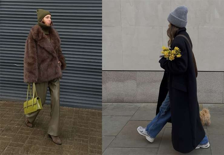 Здесь главный объем уже дан мехом, поэтому головной убор почти «растворяем». Никаких пушистых нитей и помпонов, только гладкая матовая поверхность. Шапка сидит близко к голове, высота отворота умеренная. Если у свитера высокий ворот, шарф не обязателен — образ дышит. Цвет держим в одной гамме с шубой или уходим на полтона темнее для глубины.