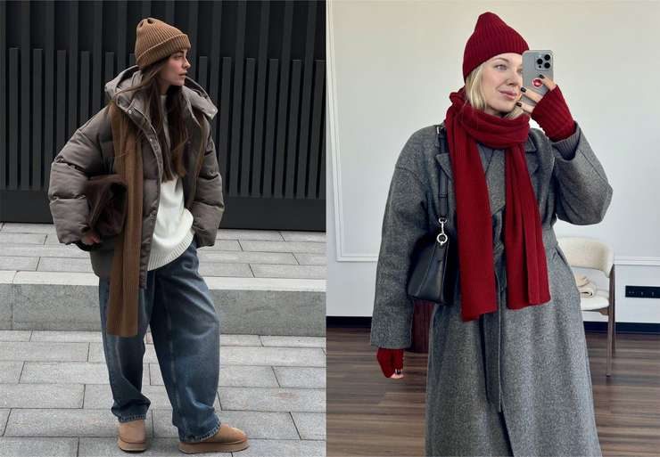 Принцип один: у лица работает что то одно. Нужен плотный шарф — берите гладкую шапку. Хочется крупной вязки на шапке — пусть шарф будет тонким и без сложных намоток. Один оборот или свободно вниз — этого достаточно, чтобы и тепло, и визуально легко.