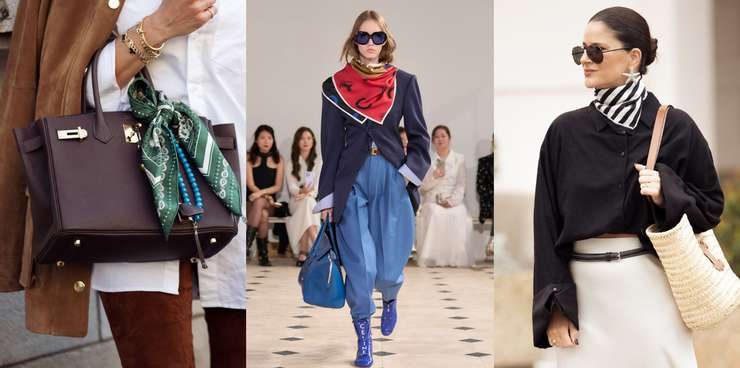 На сумке платок носим как мягкую ручку или бантик у крепления ремня. На талии — как тонкий пояс поверх трикотажного платья или длинной рубашки. В волосы — вплетайте в косу или завязывайте на низкий хвост, оставляя длинные концы. Этот прием хорошо балансирует объемные свитеры и строгие пальто.