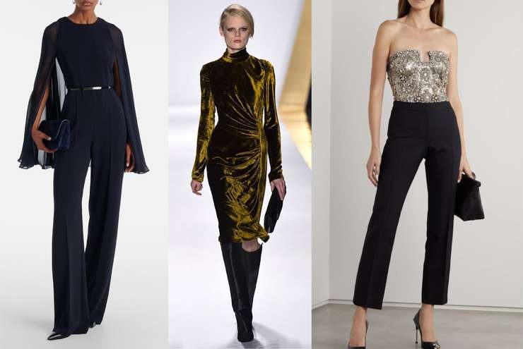Бархатное платье-миди. Бархат всегда смотрится дорого и уместно. Добавьте украшения в золоте и собранную прическу — и образ готов.