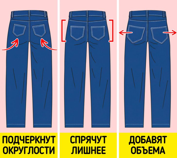 Если не хочется привлекать внимание к этой зоне и требуется визуально «сгладить» объем, подойдут модели с крупными карманами, расположенными также близко к друг другу.Если же задача — напротив, добавить объема, выбирайте джинсы с большими карманами, расположенными на расстоянии.