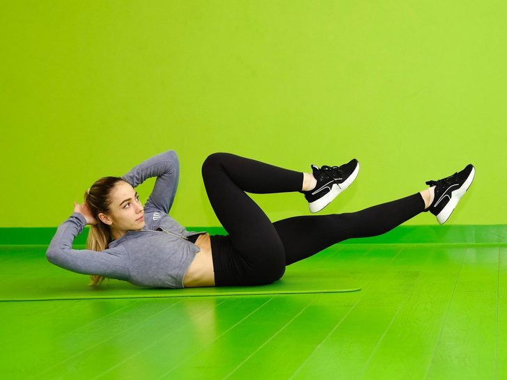 Лягте на спину, ноги согните в коленях, голени поднимите до параллели с полом, лопатки приподнимите вверх, руки уведите за голову. Выполните скручивание, потянувшись локтем к противоположному колену. Вторую ногу полностью выпрямите до параллели с полом и задержитесь в этом положении на секунду. Продолжайте движения, чередуя стороны. Выполните три подхода по 20 повторений.