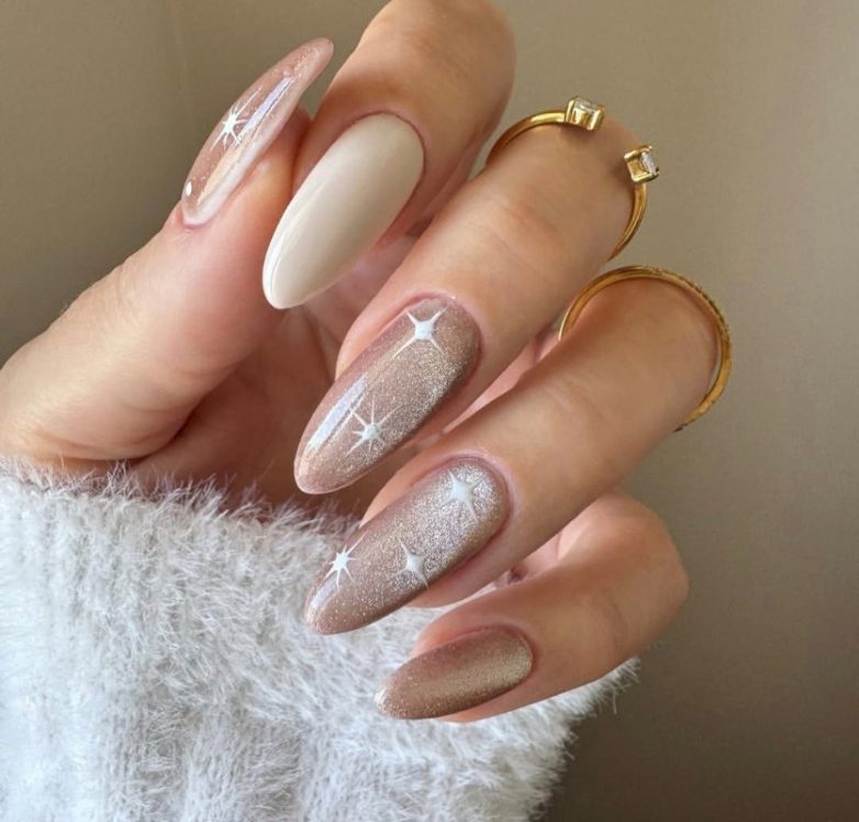 Если вы любите натуральные оттенки маникюра, в преддверии Нового года самое время попробовать магнитный лак с велюровым эффектом в песочной, бежевой или кремовой гамме.