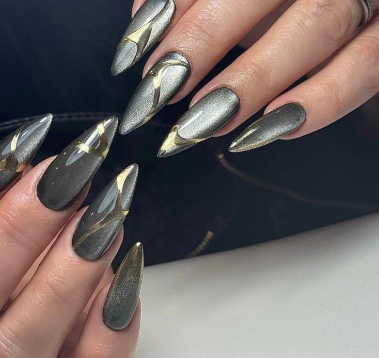Серебристый «кошачий глаз» подходит абсолютно ко всему. И к серому свитеру, и к вечернему платью. Интересная идея, которая добавит изюминку стальному маникюру, – добавить золотые или медные элементы: полосы, звезды, зигзаги, горошек.