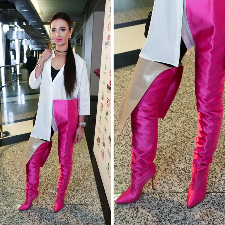 Ольга Бузова известна своим умением поразить публику. В этом случае экстремально высокими ярко-розовыми сапогами в тон губной помаде