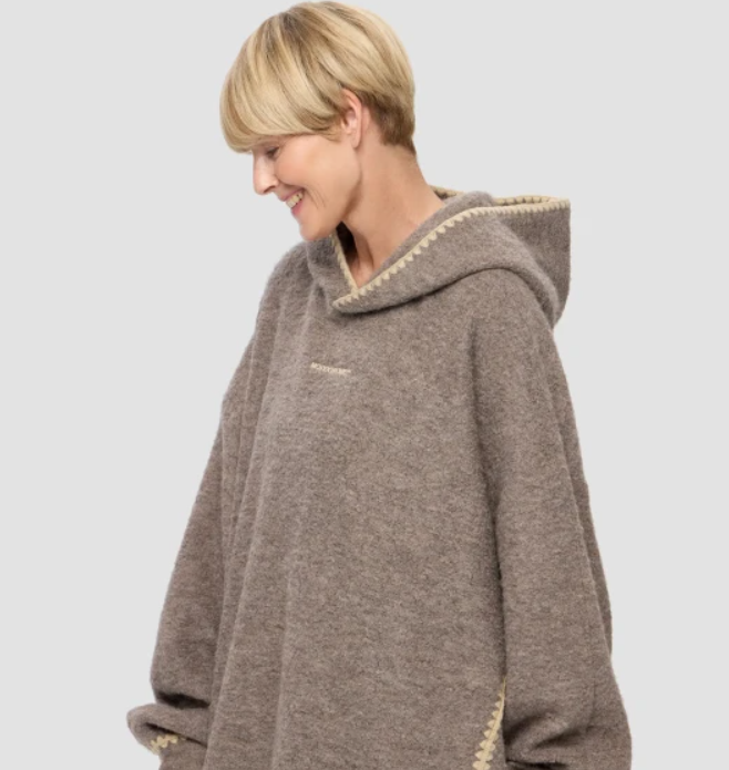 Например, из плотной ткани, мягкого флиса или футера. Капюшон и объем формируют чувство защищенности, у вас всегда будет возможность закрыться в «раковине» или немного отгородиться от реальности.