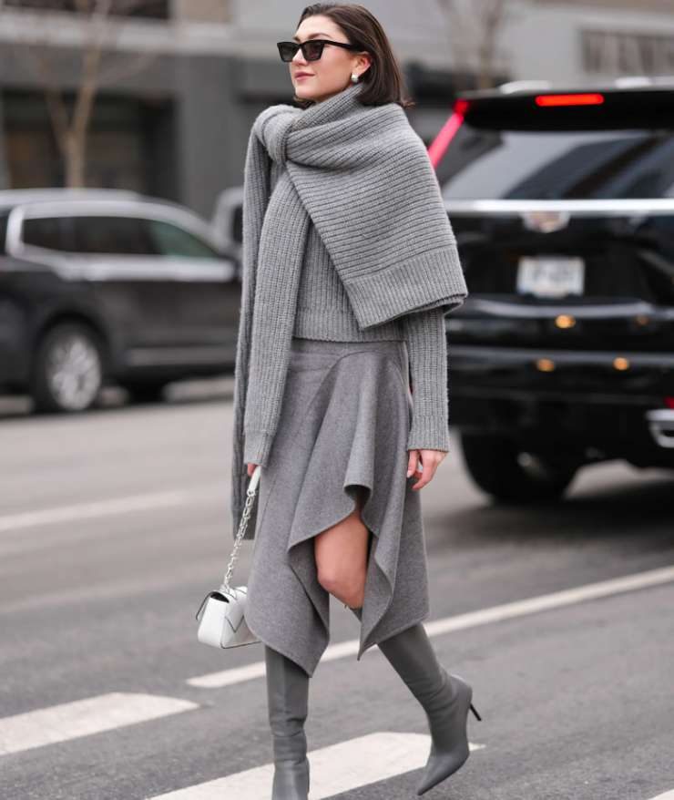 Офис: тут идеален серый свитер тонкой вязки, темно-синий пиджак, серые брюки со стрелками, лоферы. Украшение — лаконичные серьги и часы. Получится тихая роскошь без попытки произвести впечатление силой бренда. На выходных будет уместен объемный свитер меланж, белые прямые джинсы, дутая куртка или тренч, кроссовки или ботинки на протекторе. Шапка-бини и длинный шарф добавляют интересной текстуры, а образ остается динамичным.