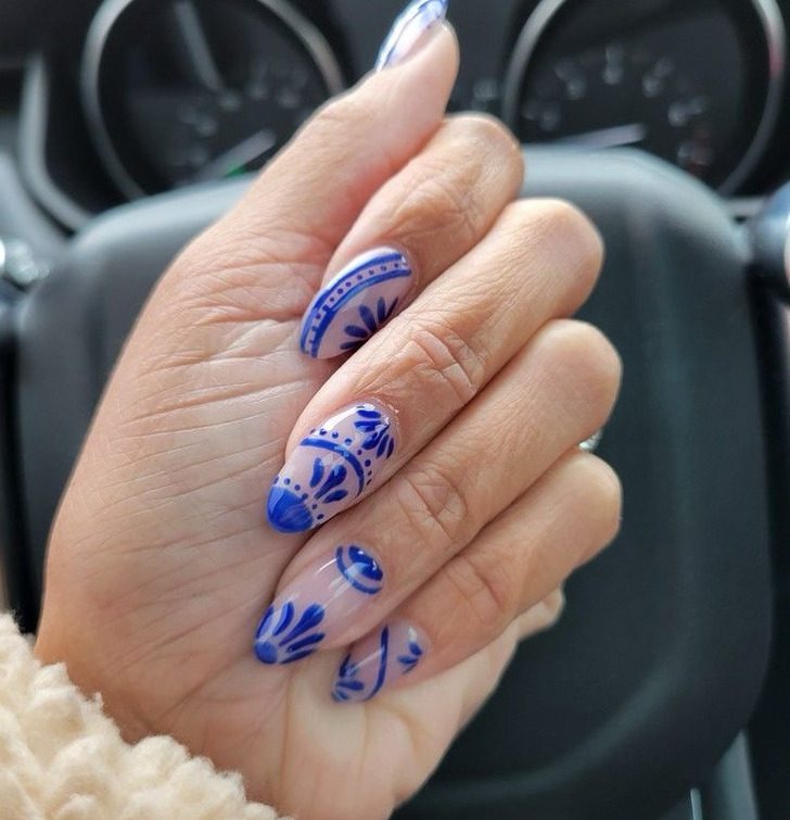 Другой маникюрный тренд, который появился благодаря Китайской культуре, — это «фарфоровые» ногти. На белое покрытие наносится изящный голубой узор, который напоминает прославленный фарфор династии Мин. Причем не обязательно просить мастера сделать подобный маникюр, можно просто найти накладные «фарфоровые» ногти.