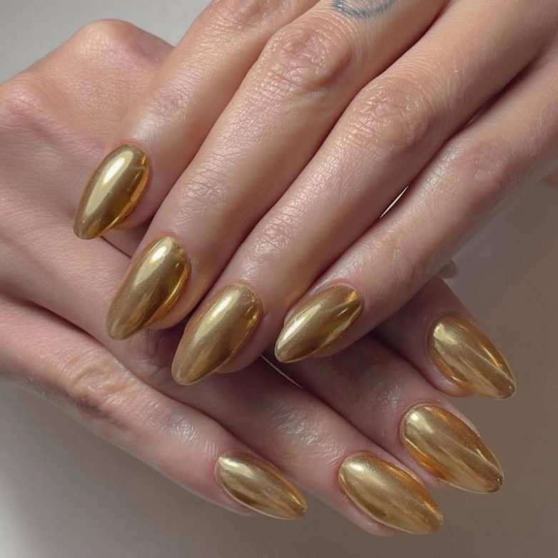 Однотонный золотой маникюр – роскошный дизайн, который не ослепляет сиянием, но заряжает новогодним вайбом. Кроме того, золотой лак, как правило, хорошо ложится на ногтевую пластину, не подчеркивает недостатки, поэтому может использоваться самостоятельно.