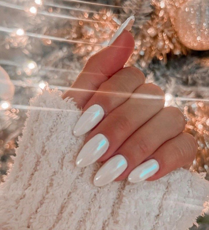 Идеальный дизайн на зиму – белый с жемчужной втиркой. Стойкость у такого маникюра не очень высокая, но красота перекрывает этот недостаток.