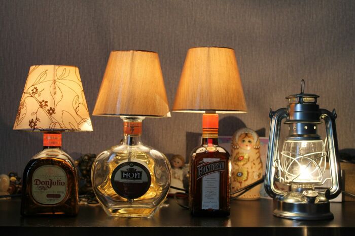 Самый оптимальный вариант — это три стеклянные бутылки, и лучше, если они будут расширяться в книжней части, именно поэтому предпочтительные взять коньячные, также можно и бутылки из-под шампанского. Их необходимо хорошо промыть, а также снять все этикетки. Провод с патроном необходимо будет пропустить через горлышко и отрезанное донышко, а после приступить к декорированию. Можно украсить лампу проволокой, верёвкой, наклеить стразы или расписать по своему усмотрению.