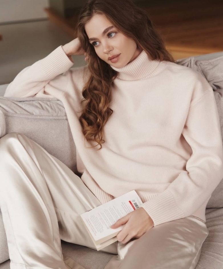 2. Кашемировый свитер оверсайз в бежевом или кремовом. Мягкий, как облако, он идеален для второго слоя: под пальто, над рубашкой, либо соло с брюками. Нейтральные тона делают его универсальным — от уютного домашнего дня до встречи в кафе с подругами или любимым.