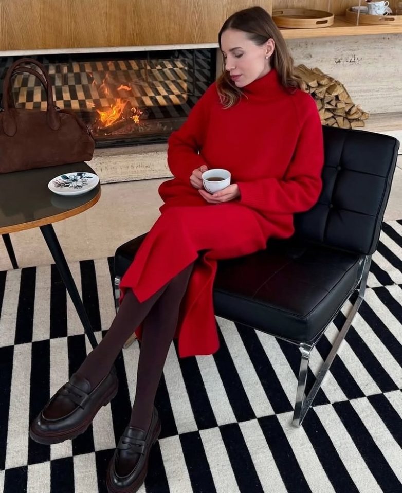 7. Трикотажное платье миди с длинным рукавом. Самодостаточный образ: добавь ботинки и шарф — готово для выхода. Вязка держит тепло, а силуэт подчеркивает фигуру.