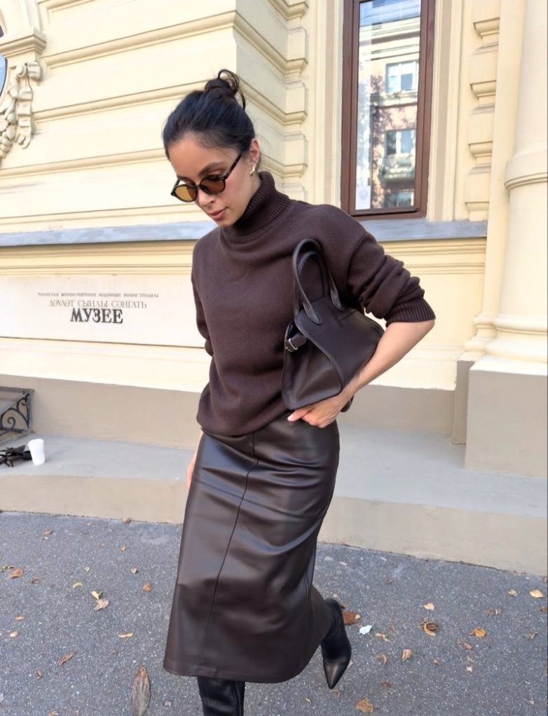 8. Юбка А-силуэта или карандаш из кожи или шерсти. Миди-длина с водолазкой — офисный хит, со свитером — расслабленный weekend look. Черная или шоколадная — вечная классика.