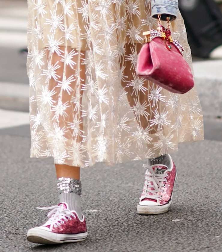Если праздник требует смелых форм — выбирайте туфли (или даже кеды!), которые сами являются точкой внимания: тут, конечно, явно нужны пайетки или кристаллы. Они идеально подходят, если весь образ выдержан в спокойных тонах — черном, молочном, или винном — а обувь становится той самой деталью, которая собирает блики света и восторженное внимание окружающих.